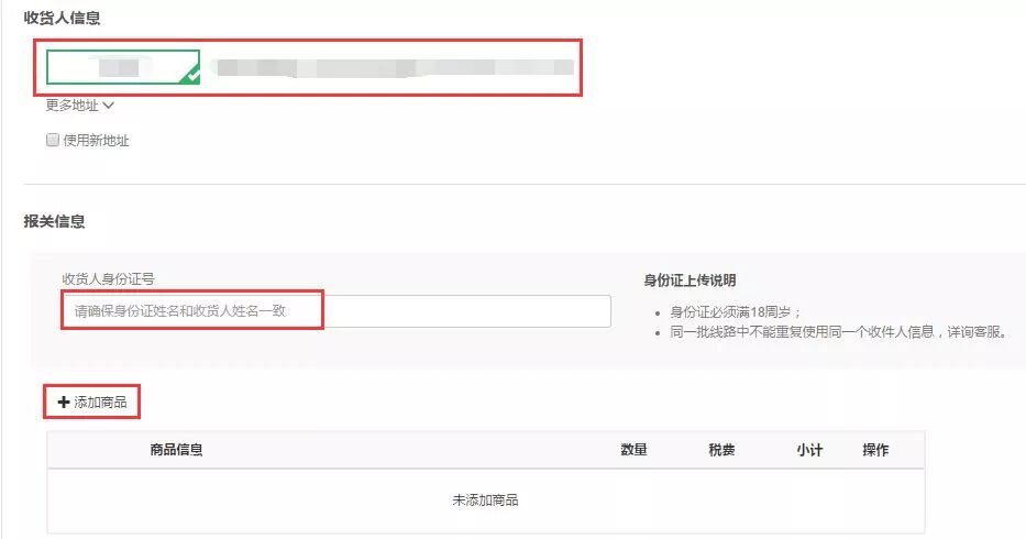 7.填写您的详细收货信息,身份证号码,报关信息请单击“添加商品”