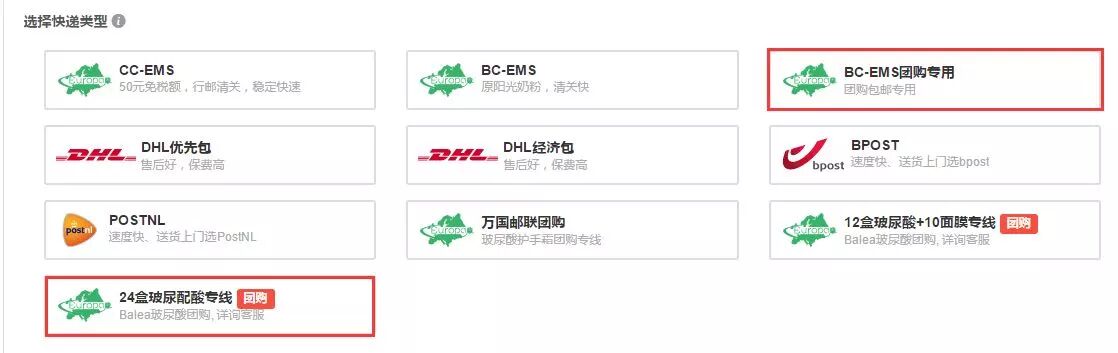 6.参团24盒玻尿酸套餐的可直接选择“24盒玻尿酸团购专线”,其他参团套餐均选择“BC-EMS团购专用”