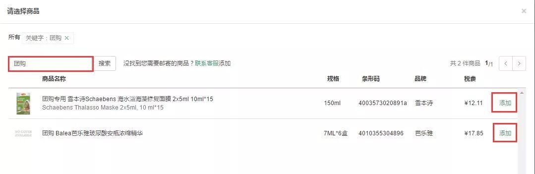 8.选择报关商品:搜索框内输入“团购”,面膜团购选择如图所示的面膜-添加,玻尿酸团购选择如图所示的玻尿酸-添加