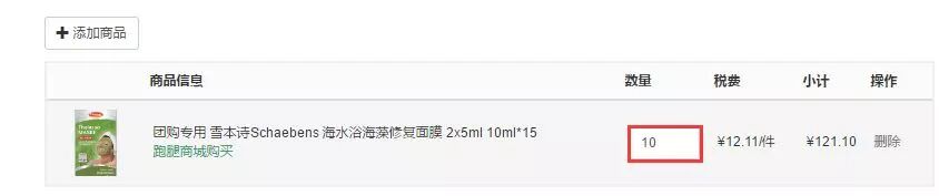 9..选择参团商品报关的数量。面膜团购直接选择10或者20,玻尿酸为6盒\组,参团6盒选择数量为1,参团12盒选择数量为2,参团24盒选择数量为4.