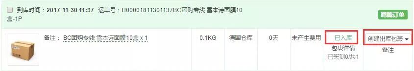 4.进入个人中心-到库包裹查询,参团商品“代跑腿”变为“已入库”状态后,即可选择订单“创建出库包裹”